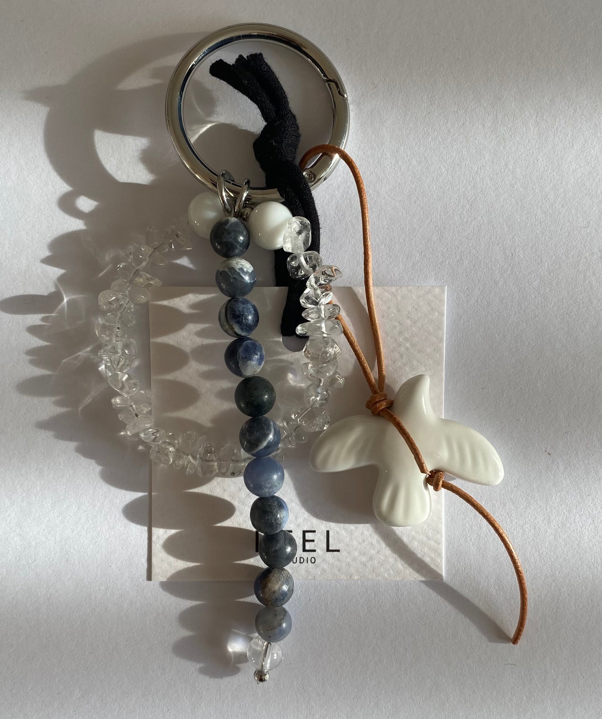 Handgefertigte Einzelstücke: einzigartige Schlüsselanhänger & Bag Charms aus Edelsteinen, Edelstahlring, Keramik-Taube und Lederband. Perfekt für Taschen, Schlüssel oder die Gürtelschlaufe